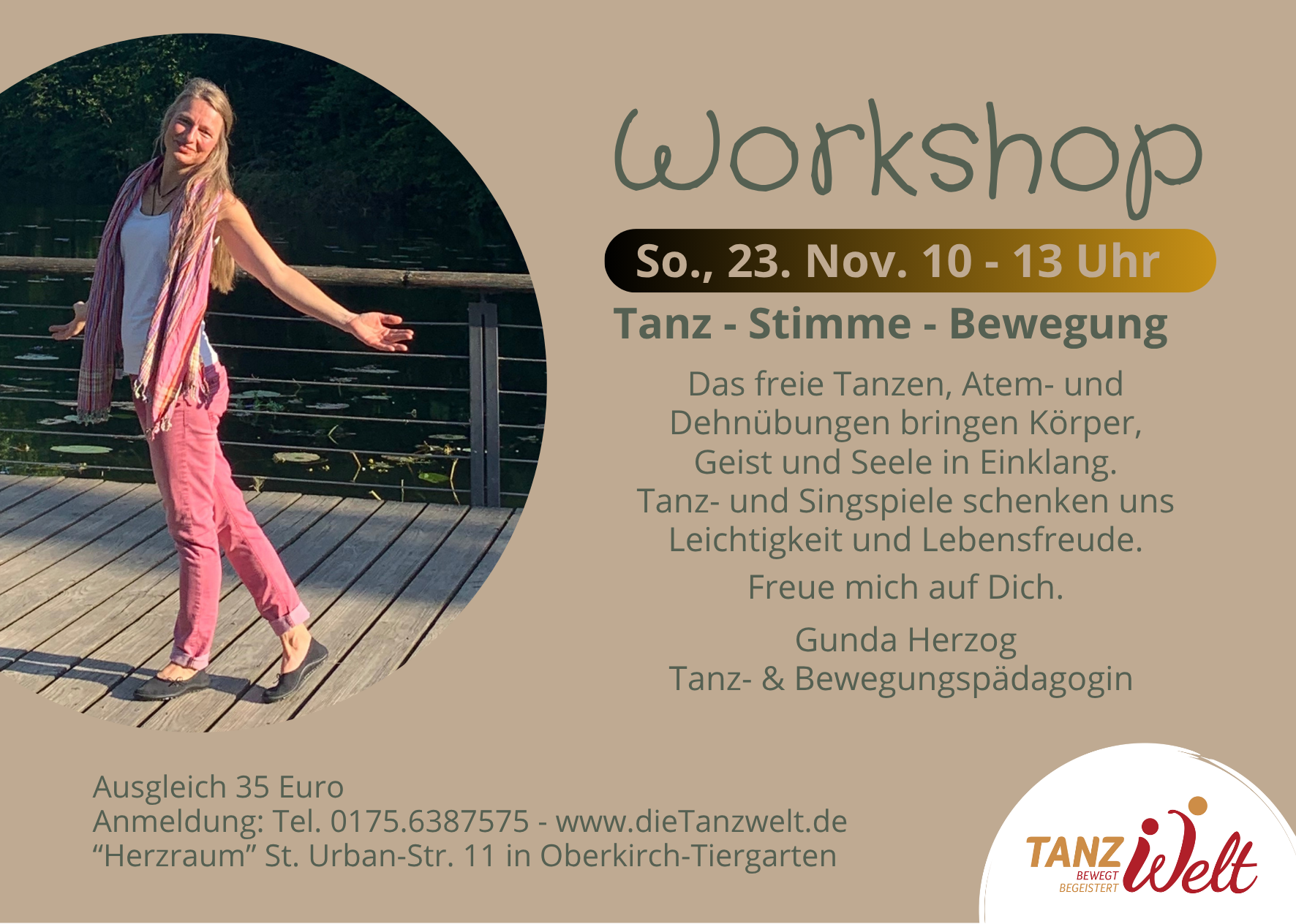 23. November von 10:00 - 13:00 Tanz-Workshop Herzraum St. Urban-Str. 11, Oberkirch-Tiergarten, Germany Herzraum Tiergarten Anmeldung per E-Mail an: info@dietanzwelt.de €35